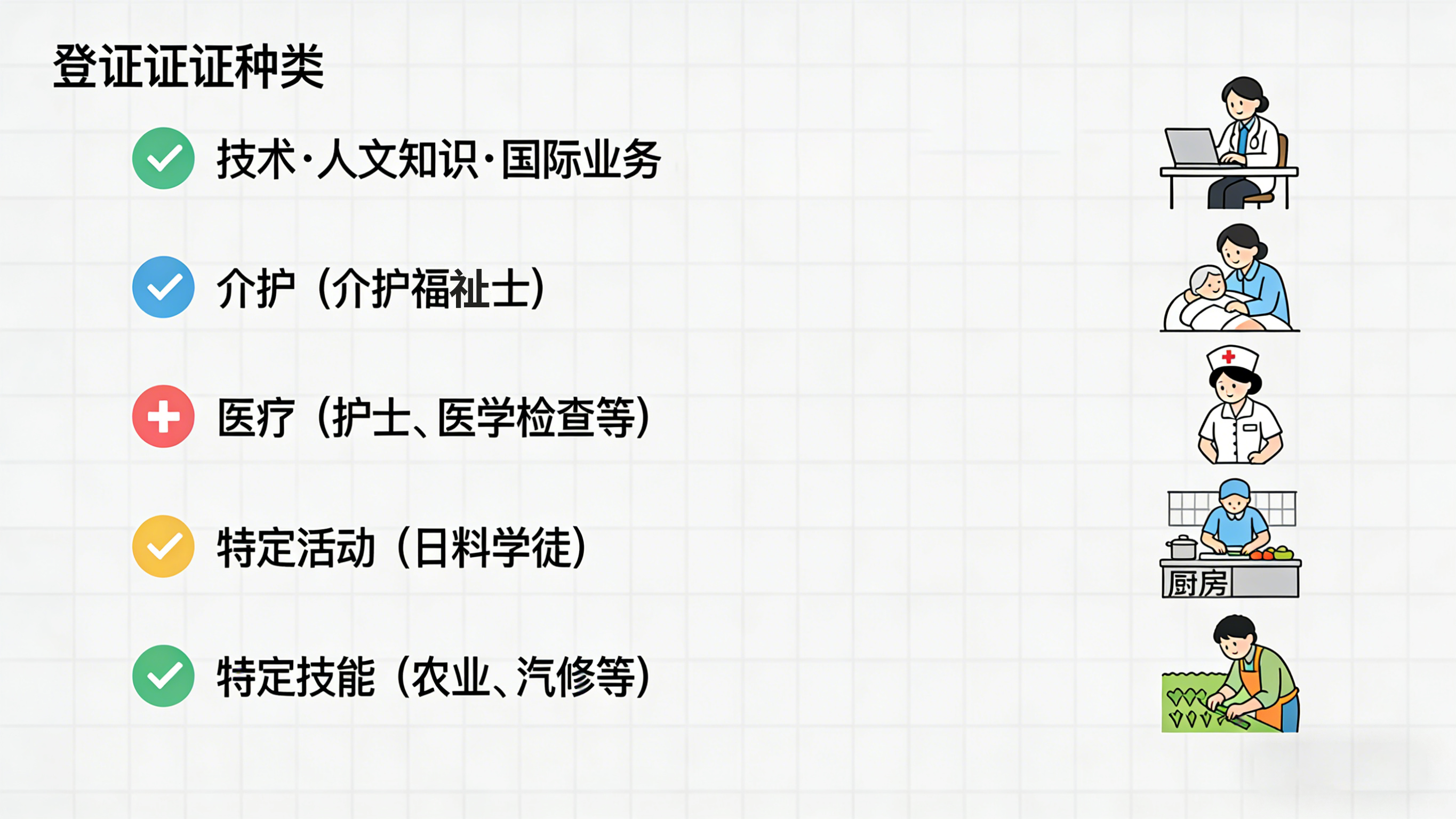 「技术・人文知识・国际业务」、「介护」、「医疗」、「特定活动(日料学徒)」和「特定技能」