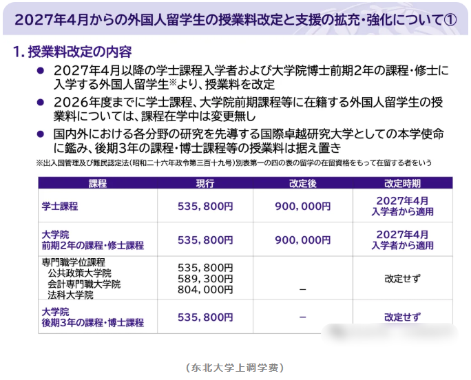 东北大学宣布将留学生学费:从27年4月起每年由原来的53万日元上调至90万日元。