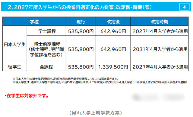 近日,冈山大学出草了学费涨价公告,拟定自2027年4月起,留学生的学费由目前的53.58万日元,涨为133.95万日元,为原学费的2.5倍。