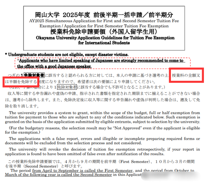 所有国公立大学都有针对留学生的学费减免制度,可以结合经济条件等减免学费的50%或100%,如果冈山大学新学费按一年134万日元的话,50%减免后是一年67万日元(2.9万元人民币)。