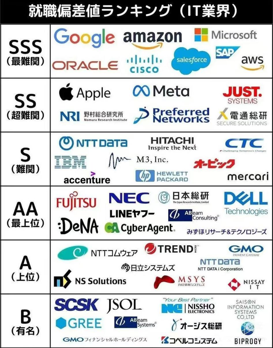 日本本土IT巨头和互联网公司,虽然难度稍低,但在行业内地位稳固,是很多求职者的优质选择。