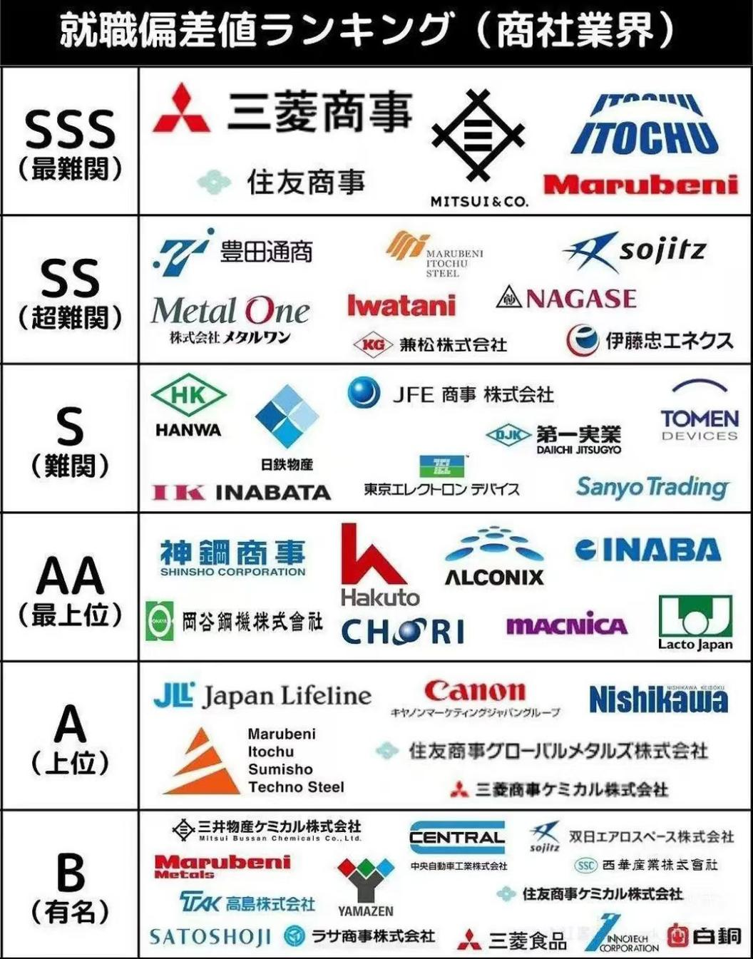 SSS(最難関):三菱商事、三井物産、住友商事、伊藤忠、丸紅