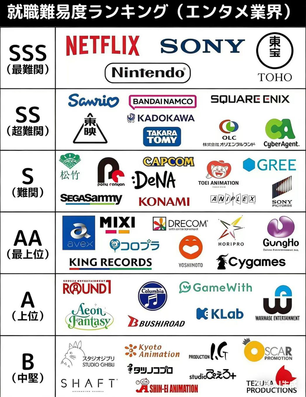 AA/A/B(上位/中堅):avex、mixi、Cygames、STUDIO GHIBLI、SHAFT等