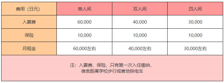 住宿费:月房租双人间3.8万日元,单人间6.5万日元