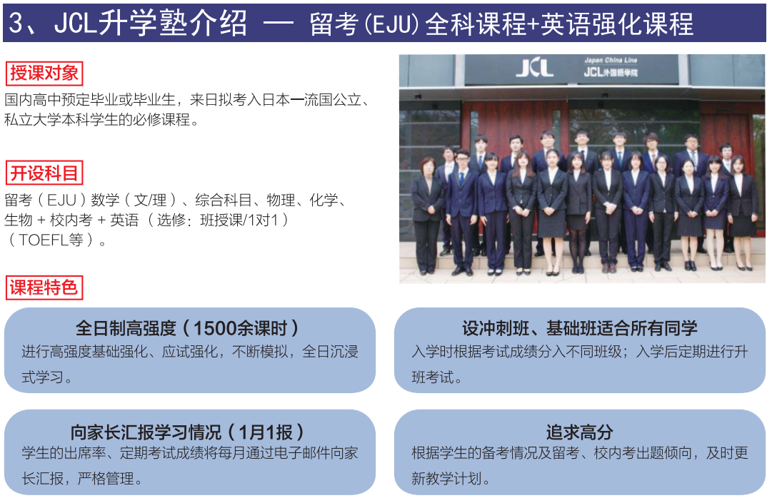 JCL外国语学院是由株式会社JCL集团设立,专业从事对外日语教育的专门学校。是由日本财团法人日本语教育振兴协会认定,日本法务省批准的外国留学生签证代理申请资格校,同时也是日本法务省入国管理局认证的A级优良校。