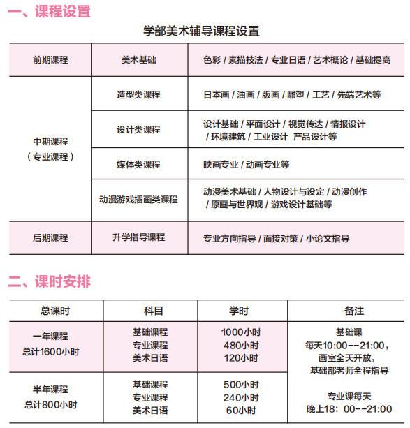 总1600小时课程【美术基础1000小时+专业指导(包含作品集)480小时+美术用语指导120小时】 |