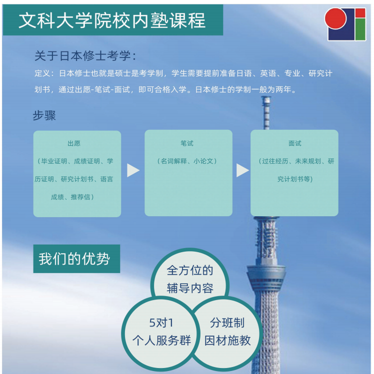 5)一对一日本研究生院的申请指导,研究课题的制定、教授选择和联系、笔试面试指导