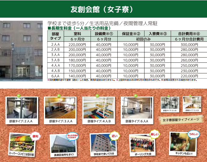 注:入寮费、保证金只有第一次入住缴纳。在合同到期前搬家,不返还任何费用,宿舍距离学校步行5分钟