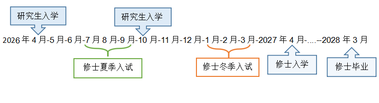 各大学的修士入学的时间多为4月,大部分大学有秋季招生考试(8月前后)与冬季招生考试(2月前后),不管哪次合格,都是次年4月入学,少数大学的合格夏季入试后可10月入学。
