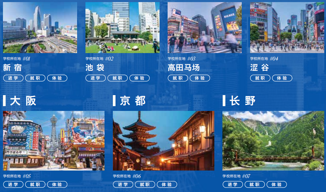 注:短期课程里新宿、池袋、京都、大阪、长野为综合日语课程,涩谷、高天马场为正常的商务日语课程。以上校区也有4周和8周的短期课程。 涩谷校有特殊的夜间课程3个月为11.1万日元 |